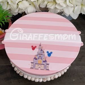 Striped lid accented with Fantasyland Castle and Mickey Mouse balloon screen art