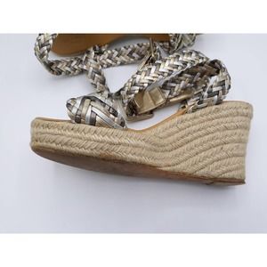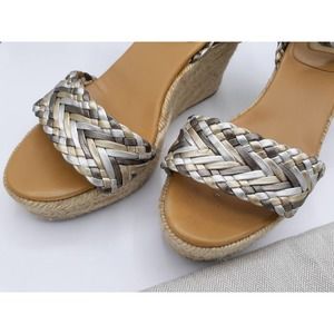 Unique pre-loved but in awesome condition with minor signs of wear silver, bronze and gold braided top and buckle ankle strap espadrille platform wedge sandals. 1" platform with 3.5" heels. They are a size 37 but fits more like a size 7.