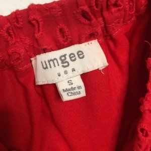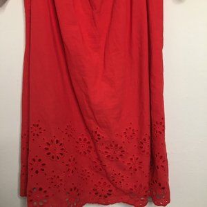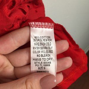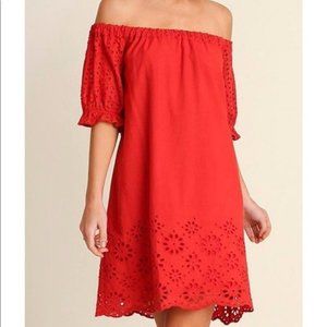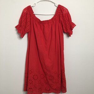 Beautiful red, off the shoulder dress with eyelet detailing on the sleeves and hem. Loose, flowy fit.