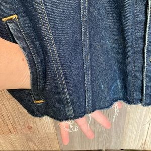 Pre-loved and in nice condition. Unusual in the distressed design and notice the side pockets are faux! I can slip my hand right thru! (Hey, just get someone to lightly sew them up if you want working pockets).