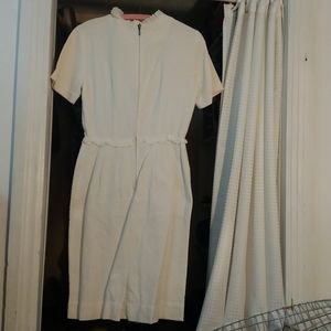Cute vintage white dress! No tag, but I believe it is 50s possibly 60s from the style. Buttons down front, raised diamond pattern, lace down front, at waist, and sleeves. Murlen brand metal zipper down back. Reminds me of a nurse uniform.