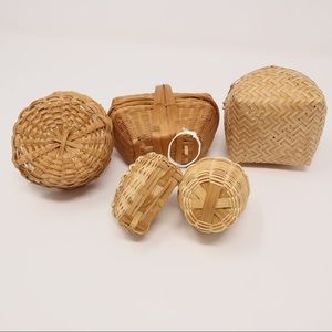Set of 5 MINI WICKER picnic baskets. All in great condition. Only minor flaw is small loose piece on bottom of one of the baskets. Nothing major and not noticeable.