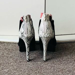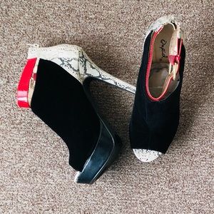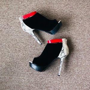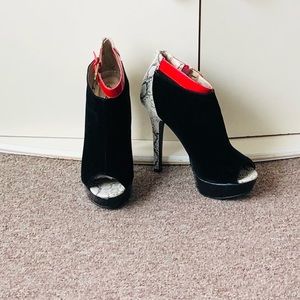 Black Faux Suede upper Red patent Ankle Straps Snake embossed Heels and inner Toe. Heels 5” Platform 1”. Worn occasionally still in great condition.