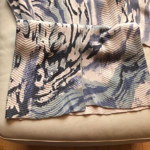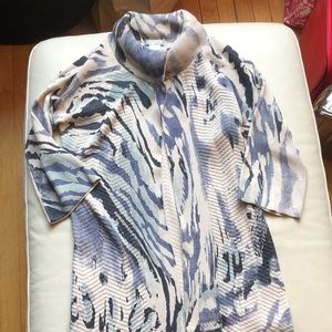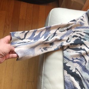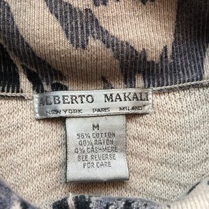 Alberto Makali Medium long open sweater cardigan with one snap at neck and bracelet sleeves. Cotton/rayon/cashmere blend. Handwash/dry clean. Color blend is beige/black/blue/sea foam. Just dry cleaned!