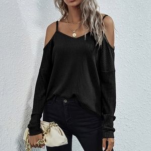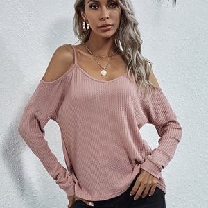 Khaki off shoulder waffle long sleeve knit top