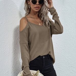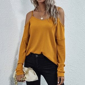 off shoulder waffle long sleeve knit top MUSTARD