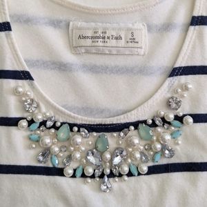Fit and flare dress with a modern nautical stripe. Pretty embellished jeweled neckline. Upper body is lined so it's not see through!
