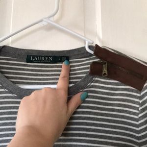Super cozy Ralph Lauren (size L) sweater top! Grey and white stripes with brown elbow pads on the back this sweater is so comfortable and in great condition- like new!