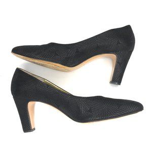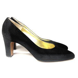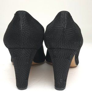 Black with slightly shiny embossed circle motif detail throughout. Medium heel slip on pump shoes. Leather upper, partial leather lining and soles. Made in Italy. Balance is man made. Pre-owned. Excellent condition. Minor signs of wear on soles.