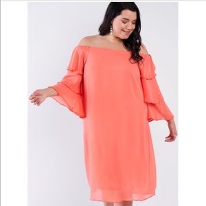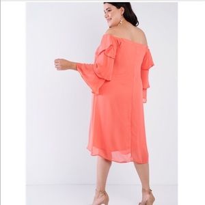 Dress Features: Coral,lined,off the shoulder, reared ruffled sleeve,midi, elastic stretched neckline, loose fit, boho chic.