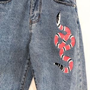 SNAKE IT TIL YOU MAKE IT! High waisted jeans in a perfect vintage light wash featuring snake print detail in front and functional pockets. Size small. Excellent pre-owned condition, one unnoticeable spot on the left pant leg, see close up for details. Measurements are approx 14" across the waist, 11" rise, 36.5" length.