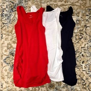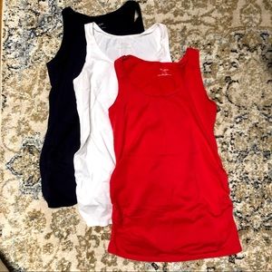 Bundle of 3 tank tops. Motherhood Maternity side ruched scoop neck tank tops. Red, white and Navy Blue. Very stretchy fabric. All size small.