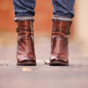 š¢The Frye Pattie Bootie harnesses the timeless refinement of a classic riding boot in a compact, all-season size. Rich cognac leather bears a well-worn patina that simply gets better with wear. A blocky stacked heel elevates a burnished leather bootie trimmed with a neat belt at the shaft. A must have for your fall & winter wardrobe!