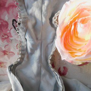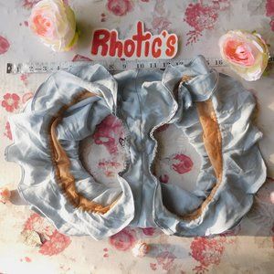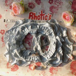 NWT For Love & Lemons' beautiful rare Pale Blue (almost looks silver in some lights) Soliana sleep shorts in size Small. Perfect for people who are in love with ruffles and frills, but still want to look poised and sexy. It has a peak-a-boo nude mesh between the frill clusters on each side of the hips. Has elastic, stretchy bands at the waist a legs holes. There's measuring tape in the photos for approximate size in inches.