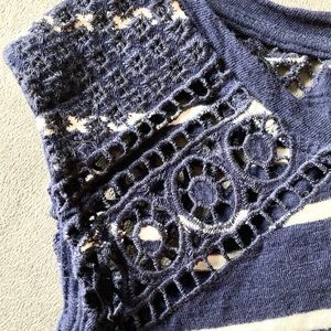 Nautical inspired striped tank top with crochet sleeve detailing and knot tie in the front. Super adorable and perfect for summer!