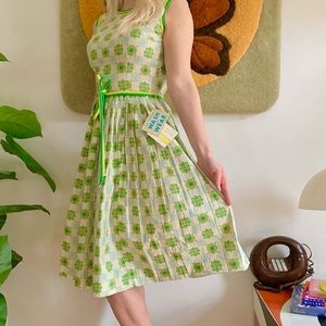 Deadstock 1950s checkered block print cotton sun dress with green + yellow piped trim and matching fabric belts! 🍋Fitted bodice with full pleated skirt and metal zipper in back + hook closure. Betty Barclay size 7 - est size XXS