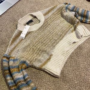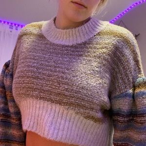 Cozy colorful sweater, the softest material I’ve ever felt. The sleeves go out and change color. cuts off at the stomach.