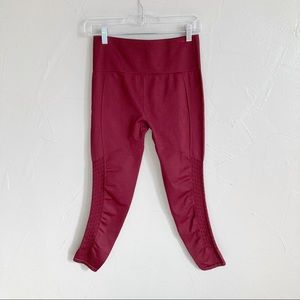 •Features: seamless, high rise, 7/8 length leggings, in the color rust, which is a maroon red color