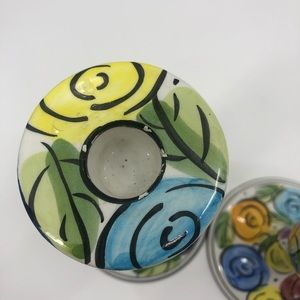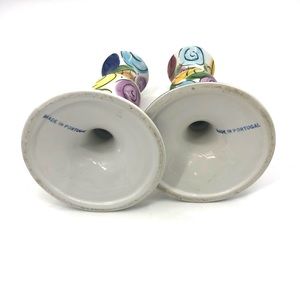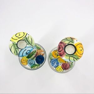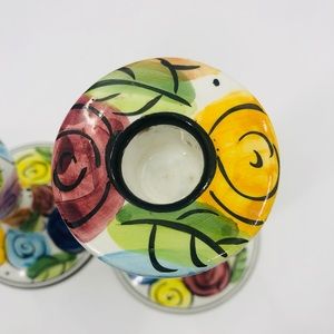 ✨Beautiful artsy multicolored floral hand painted candle holder set. Great set to add color to any setting. Vintage. Made in Portugal. Condition preowned. Please see all photos. Rim on one candle holder can use touch up of black paint but not really necessary or noticeable since candle will be in that space but doable. 8.5” height.