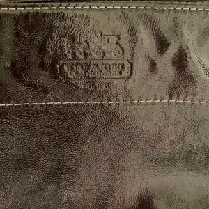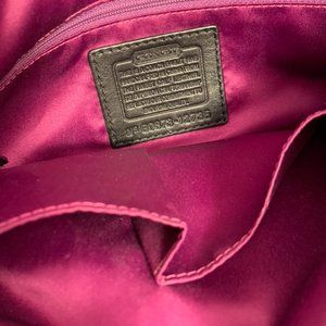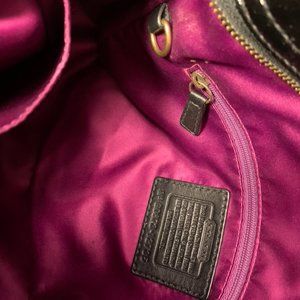 Coach logo embossed on the front (2nd photo).This bag is all about the hardware--big brass buckles, rings, and nailheads. The brass is not shiny, but has that aged patina. There is white stitching on the outside. Inside are 2 open pockets and a larger, zipped pocket. A ring inside the bag allows you to attach your keys. The bag has been worn but is in like-new condition except for the two feet, which have a few inevitable scratches. See measurements above. The strap drops about 9 inches.