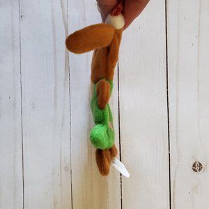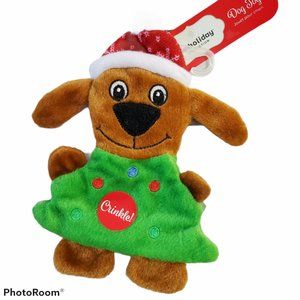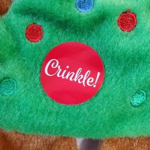 This is a Christmas themed holiday toy for dogs in the shape of a dog with a tree body and santa hat on his head. Features a crinkle sound when they chew/play with it.