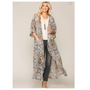 Boho Windowpane Floral Print Long Kimono w/Pockets