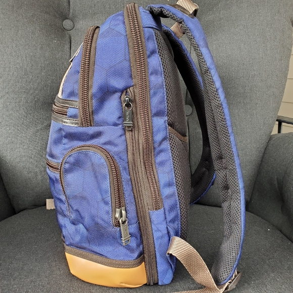 Practically new; has seen very little use. Geometric blue w/ leather accents.