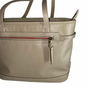 Two inside pockets. Cell phone pocket. Inside keyhook. Outside zip pocket. Lined with red interior. Zipper closure. Feet. Strap drop length 10". Includes credit card wallet with 6 credit card slots and Snap closure.