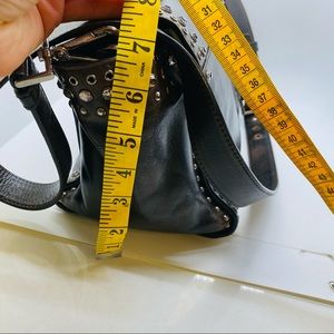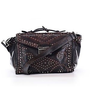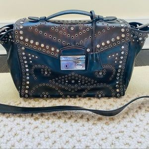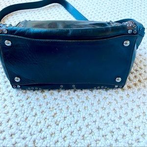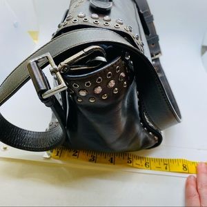 Vintage vitello leather with silver hardware. Grommet, stud, and crystal trim. Top handle; removable shoulder strap. Flap top with engraved push-lock closure. Open compartments at each side. Inside, leather lining and zip pocket. 7"H x 11"W x 6 1/3"D. Made in Italy.