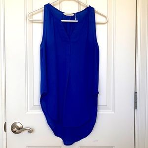 Brilliant blue tank with V-neck. Longer front back then sides. Pit to pit 17”. Length shoulder to from 25” and 27” in back. Size small.