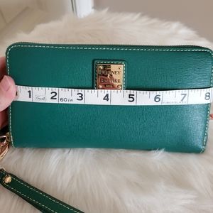 Great used condition saffiano leather large zip around wallet wristlet in the color Leaf. Zipper pull has slight tarnishing and one tiny dark "dot" on bottom of the wallet (please see photos). Inside is clean. Unfortunately I do not have tags or registration card as I am not the original owner. Comes from a smoke free pet friendly home. Please see all photos as they are part of the description and I have included the measurements in them.