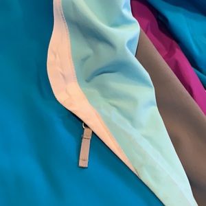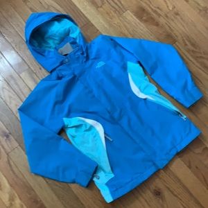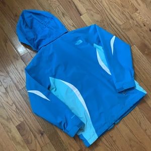 The Northface girls size medium 10/12 spring coat with detachable hood, 2 tone blue and white*** light signs of normal wear around the pockets, see pics****