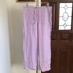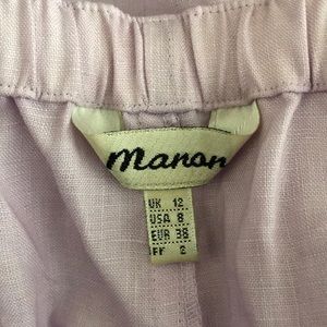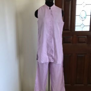 Manon 100% linen pants size 8 in lavender color. Set is in excellent condition. There are no rips, top has a couple light stains that didn’t came off after cleaning. Top has side slits, pants have a drawstring adjustable waist. Approximate measurements: top pi to pit 19”, length 30”, pants inseam 30”, leg opening 10”