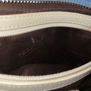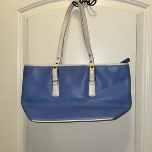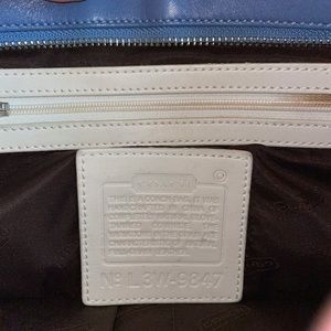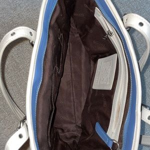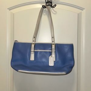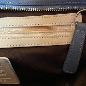 Coach Cadet blue and ivory leather satchel with zipper closure. This bag is pre-owned (see photos for scuffs/marks from use) but still in great condition with a lot of wear left!