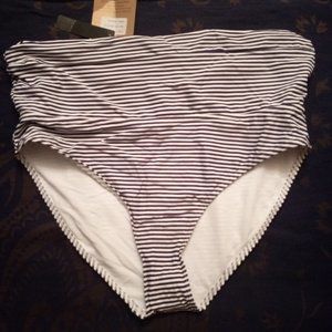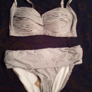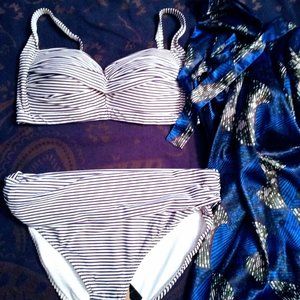 Striped two-piece bikini set is fully-lined & features a twist front top w/ molded cups. Full coverage bottom can be worn foldover style or high-waisted.