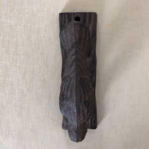 New, rustic finished metal with brown finish, requires 2 screws, not included. Magnet sticks to it so I’m guessing iron? 6” long.