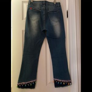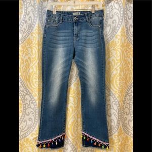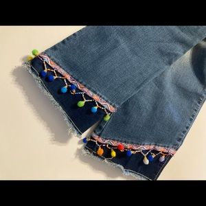 Blue jeans, size 8. 75% Cotton, 23% polyester, 2% spandex. Cute, colorful beading and Pom poms with tribal embroidery at bottom. Factory fading. Classic 5-pocket style. Pre-owned. Excellent condition.
