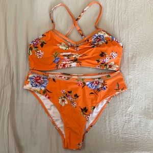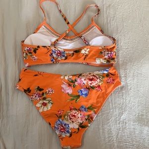 BRAND NEW! With panty liner orange floral bikini. Removable breast cups. Adjustable racer back. Size medium