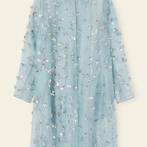 Italian floral embellished silk sky blue A-line trench coat. Oversized fit with concealed snap button closure and two exterior pockets. Adjustable button tab at cuffs.