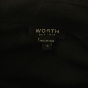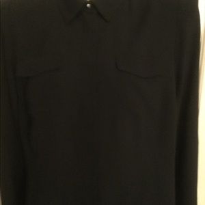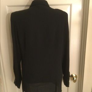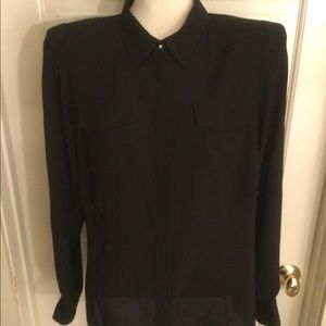 Lovely black silk crepe blouse from Worth NY. Button front under hidden button placket. Long sleeves with double button cuffs. Patch pockets on chest. Shoulder pads that are very loosely stitched in. They are easily removable. Great blouse to wear under a suit, with jeans, or alone with pants or a skirt. Great staple piece for your wardrobe! Only worn once. Like new!