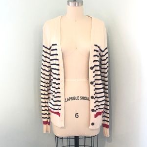 Cream colored cardigan with black and red horizontal stripes