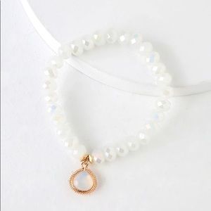This quaint bracelet can dress up any look with its white, faceted beads (with a slightly iridescent sheen) that surround a tear-drop shaped clear charm in a gold setting.