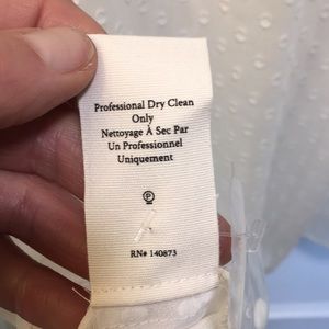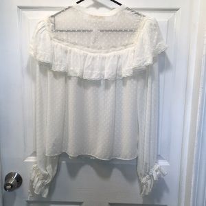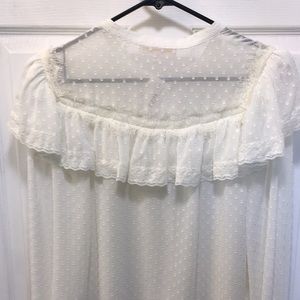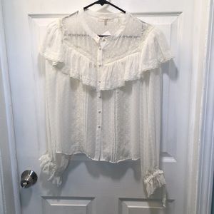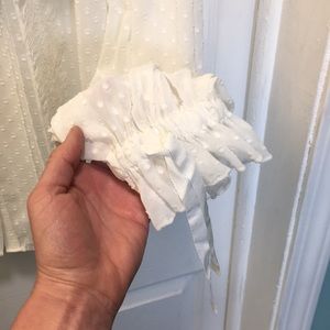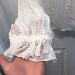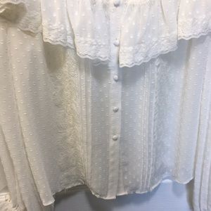 Light as air silk Swiss dot fabric trimmed with beautiful floral motif lace creates the perfect day to night top. The Erica top is this season’s easy, essential blouse with button front and relaxed fit for breezy comfort. Body is unlined silk Swiss dot, while a yoke bodice ruffle cascading from front to back is floral lace finished with tiny dot trim. A full, billowy sleeve with self ties. Purchased at a small boutique - tags still attached. Never worn.