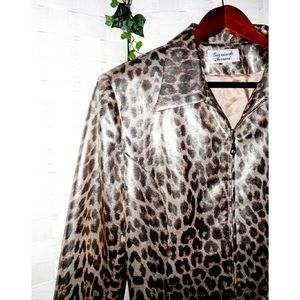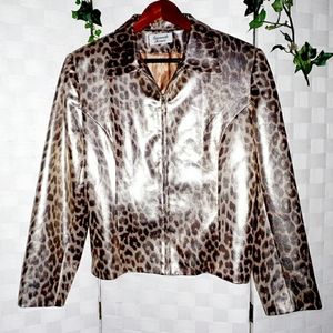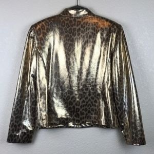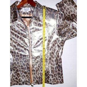 Giancarlo Ferrari Zip-Up Leopard Print Blazer Jacket, in color gold, with metallic silver and brown leopard print, features a goldtone zipper and pull tab, long sleeves, straight hemline, pointed collar, lined. Fabric Composition: Body 100% pokyester; lining 100% acetate. UEC excellent condition, women's plus size 14 measures at bust approx. 41" inches; length 22.5". Retail $200. Fire_Attire price $73 with discounted ship and 1 - 3 day USPS shipping.