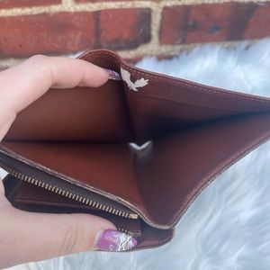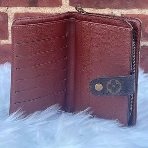 Authentic Louis Vuitton snap wallet. Has 6 credit card slots, 2 interior pockets, one cash pocket and 2 coin compartments. Some minor wear to the glazing and tarnishing to the hardware. Will fit a passport. Comment with questions π