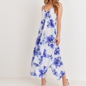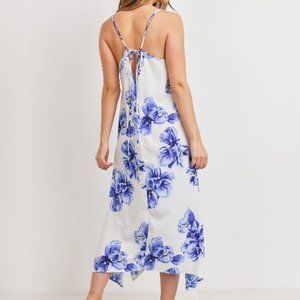 Floral Print Handkerchief Hem Maxi Dress Blue. Flowers pattern a sunny summer dress with adjustable spaghetti straps and swing handkerchief hem. Floral print brings a summery airy boho vibe and a v-neck. Sleeveless. Empire Waist. Tie back slip over. Made in the USA.