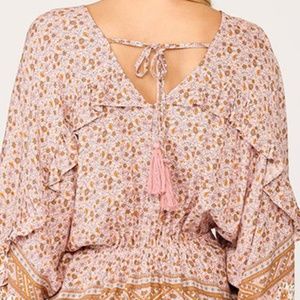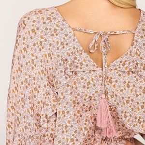 Gorgeous floral printed boho style top with ruffle detail on the sleeves. Features a v neck front and open back with tassels. Ruffle detail along the front, sleeves & back of the shirt. Elasticized around the waist and ends of sleeves.