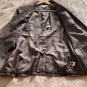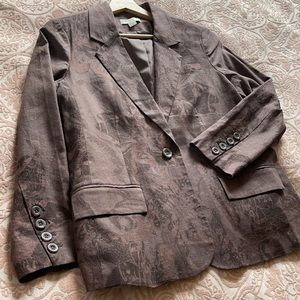 Like New! NWOT Coldwater Creek size 14 petite (fits more like a 10/12- see pics for measurements) linen blend blazer in a dusty plum tone with abstract print. Single button, double breasted. Front pockets, inner pocket. Slit in back still stitched and extra buttons on tag. Long, boyfriend blazer. Some very minor pulls in the fabric (typical of linen- but nothing serious or noticeable). I purchased to wear oversized but it’s smaller than expected. Smoke/pet free home