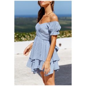 Beautiful periwinkle swiss dot textured romper with off the shoulder style short sleeves, dainty ruffle trim and a backside bow tie.