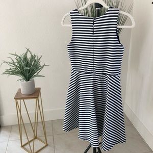 Sophisticated and timeless stripes for this navy blue and white girls dress. Size 14 girls. Features a button closure in the back, slightly fitted through the chest and waist, with an a-line type skirt.